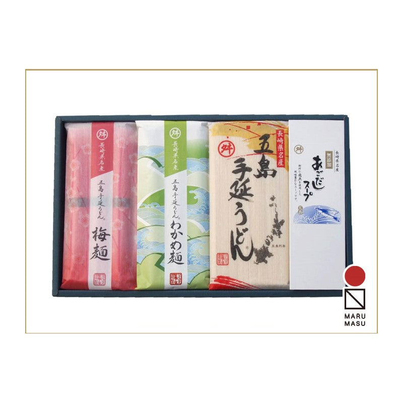 - 五島手延うどん・梅うどん・わかめうどん・無添加あごだしスープのセットです。一つに白・紅・緑の3色の五島うどんを詰め合わせた、彩り豊かな贈答(ギフト)セットです。